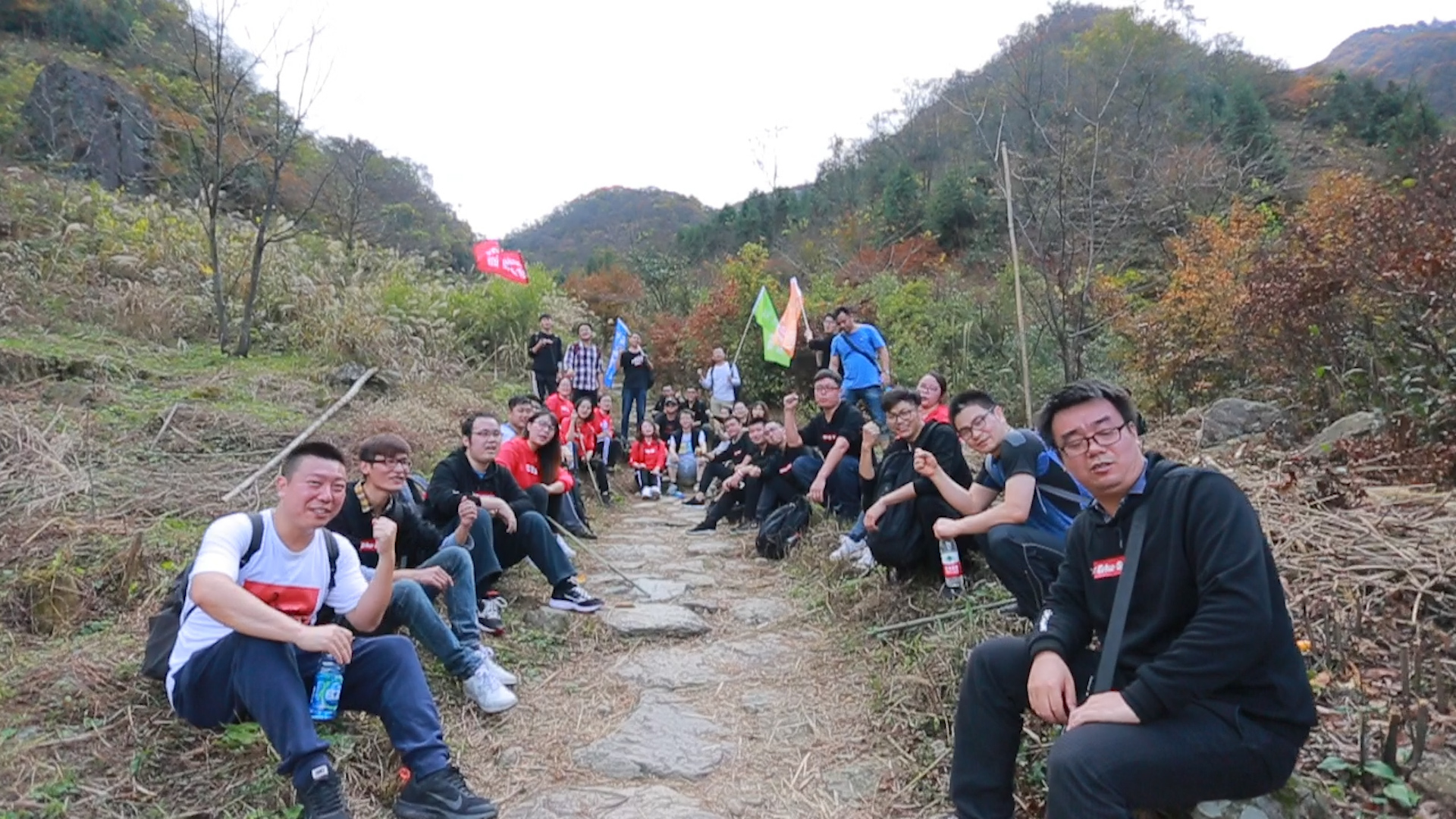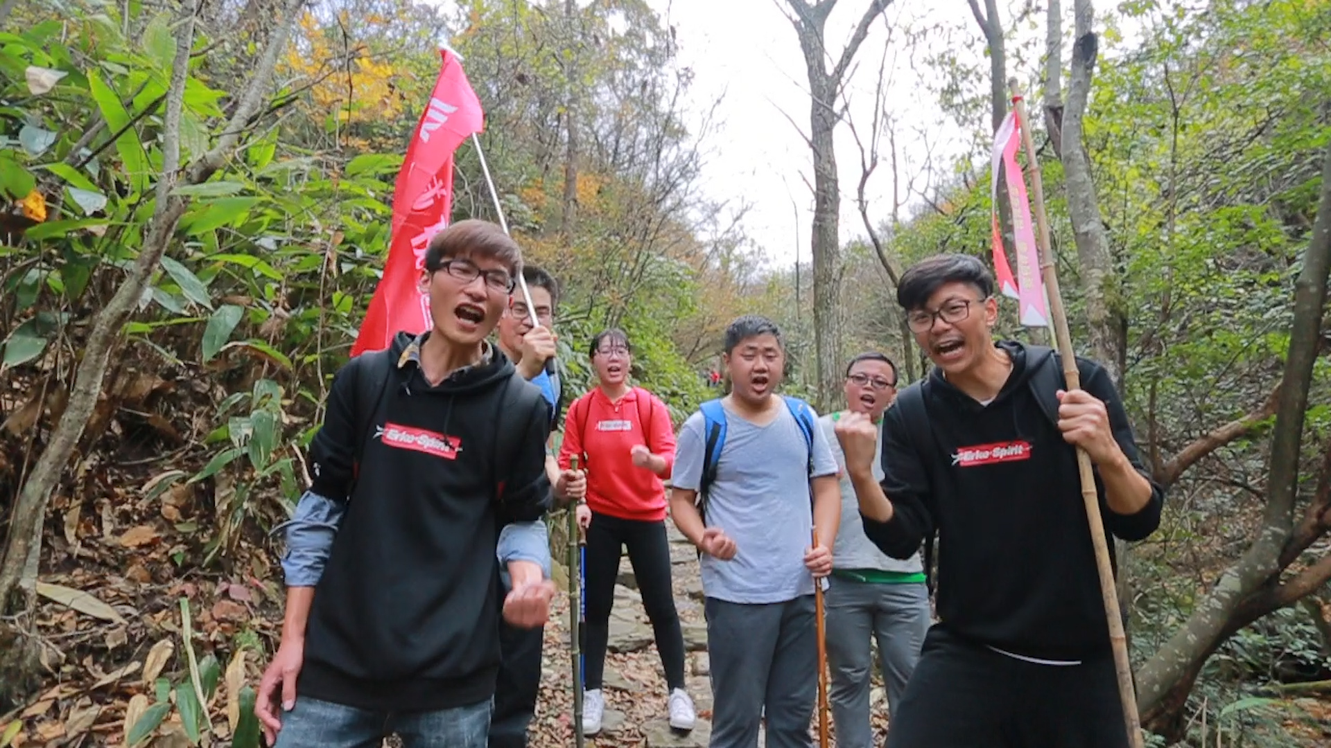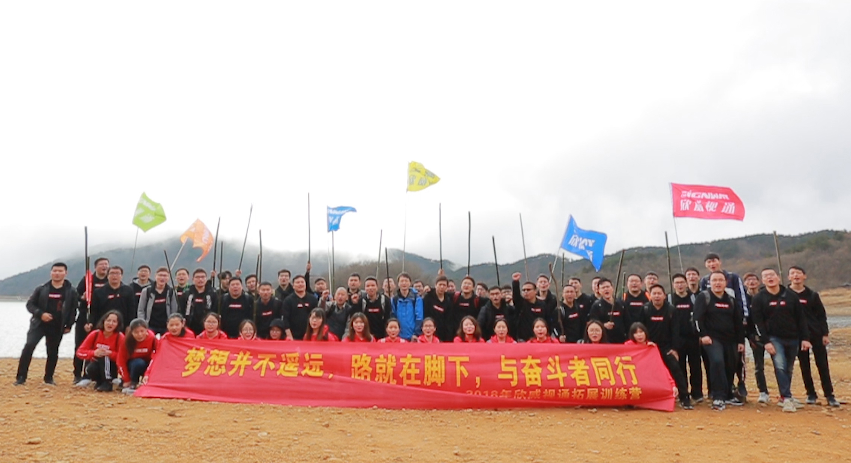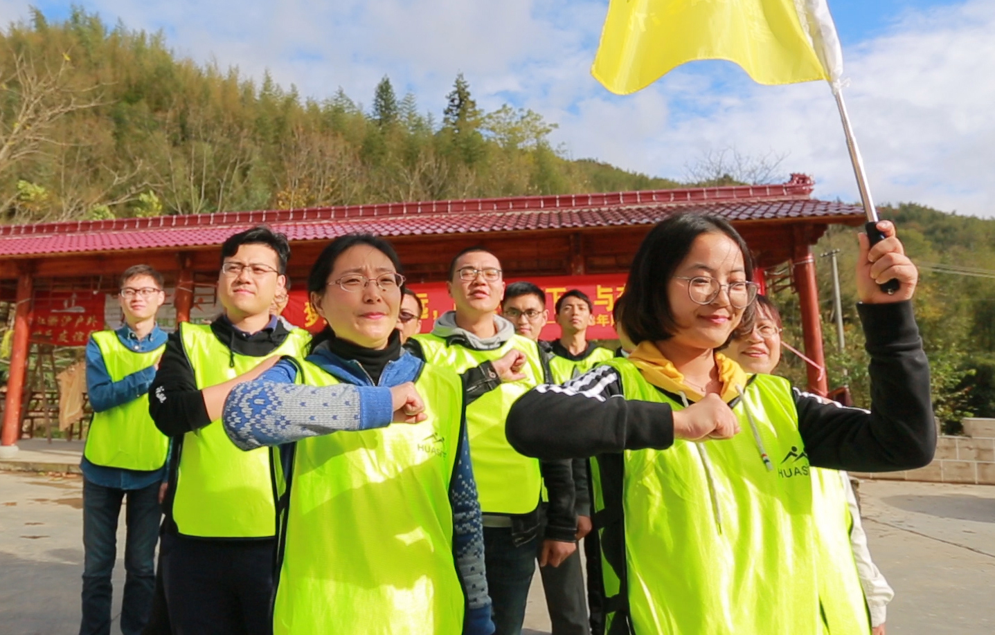 翌日清晨,欣威小伙伴們齊齊站在吳越古道山腳下,揮舞著彩色的旗幟,整裝待發,穿越吳越古道,突破自我,挑戰不可能!