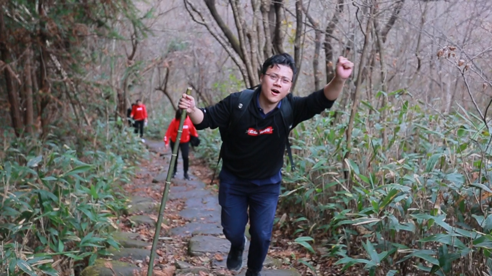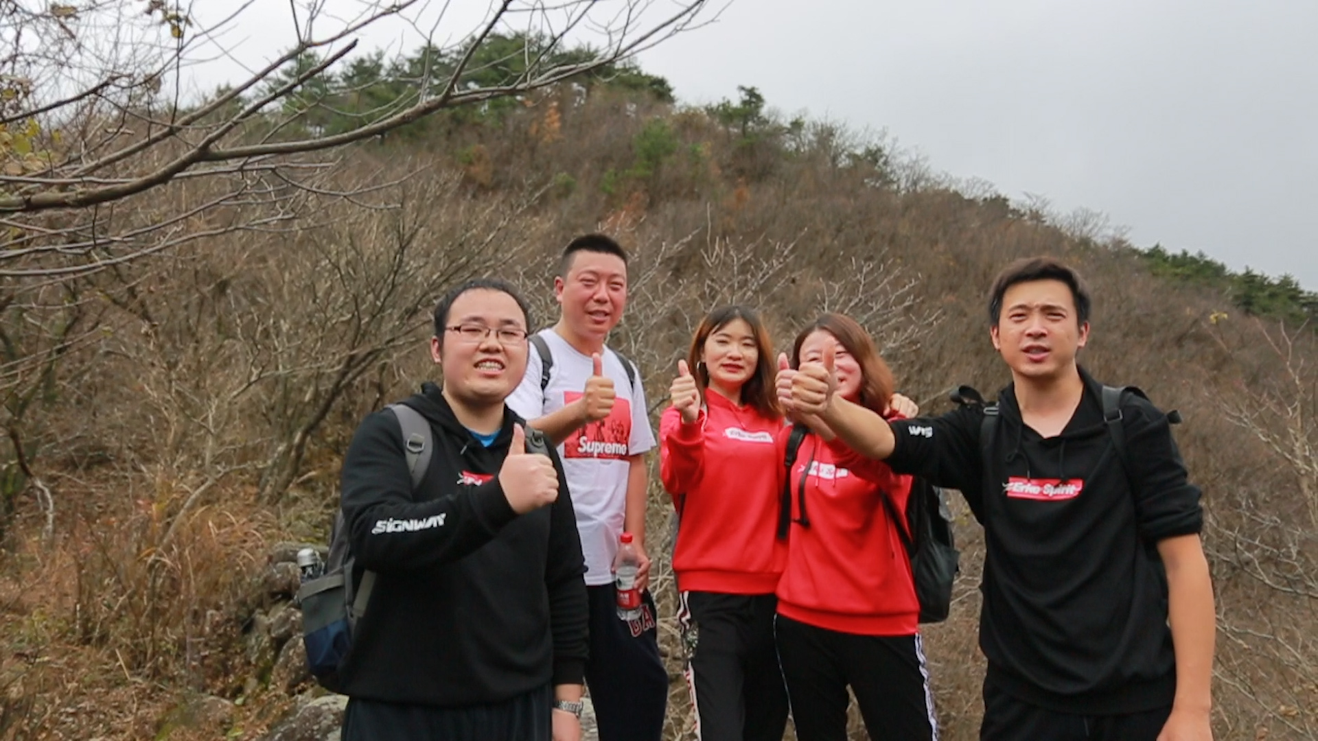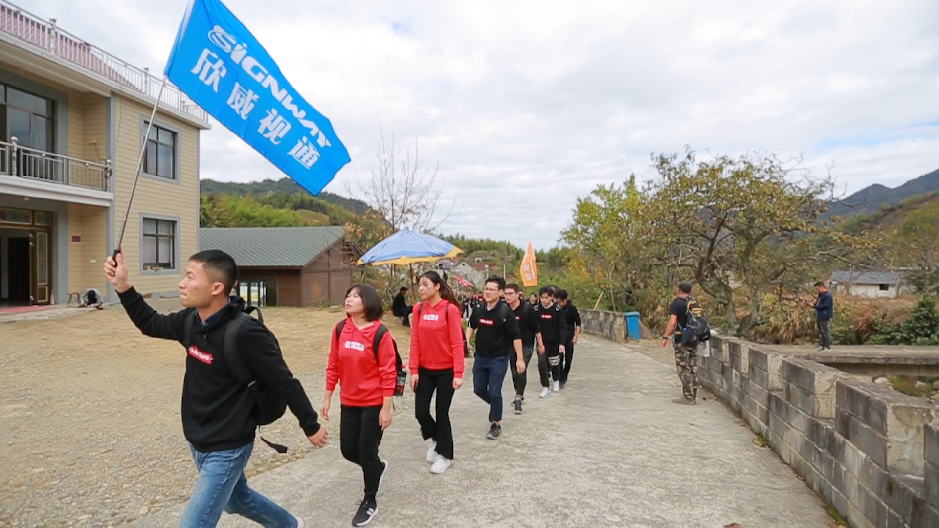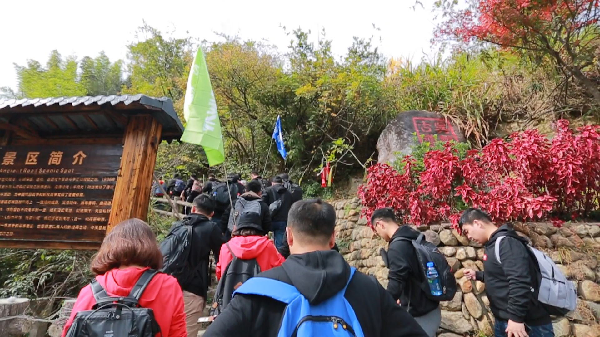 翌日清晨,欣威小伙伴們齊齊站在吳越古道山腳下,揮舞著彩色的旗幟,整裝待發,穿越吳越古道,突破自我,挑戰不可能!